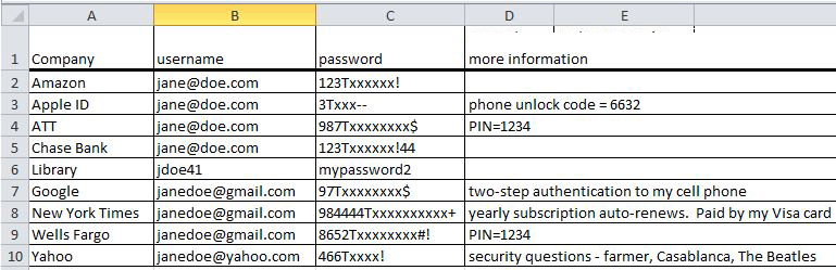 I keep all of my passwords in an Excel spreadsheet like the one in the grid