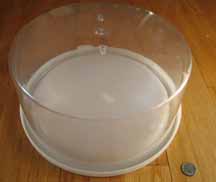 Since silkworms don't drink water, they get their moisture from the leaves so they must be fresh, not dried-out. Unless you want to change leaves three times daily, you need a covered container to raise the worms in. It should be almost air-tight to prevent leaves from drying out, but have small air holes for ventilation. Try a transparent plastic cake cover with the handle removed to allow air in through the screw-holes. The photos below show one of these covers, which is about 14" across, plenty of room for about 50 fully-grown silkworms. You can buy these covers and trays from Amazon -click on the photos to get the link.